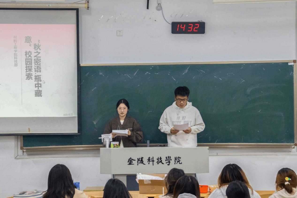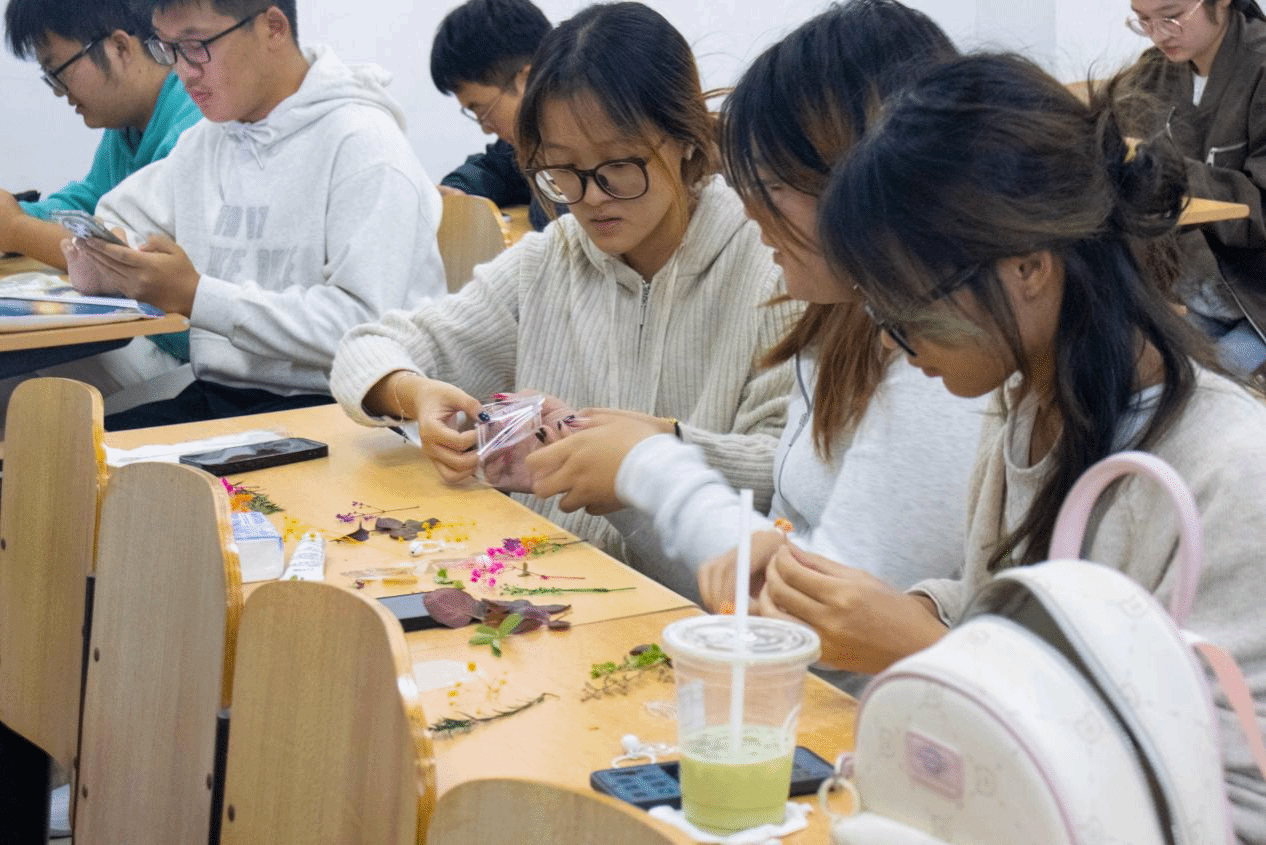 活动伊始,主持人介绍了活动的内容,接着大家整齐有序的排着队拿着秋日素材材料,在现场同学的引导下,大家围坐在一起,将收集到的自然素材转化为创意作品:有的用枫叶、银杏叶拼贴出校园建筑的轮廓,让秋日风景与校园记忆重叠;有的将干花与书签结合,用透明胶带封存花瓣的柔软与色彩;还有同学制作挂件,把落叶与干花“藏”进瓶中,让秋日的生机成为可随身携带的“时光纪念品”。现场不时传来创意碰撞的讨论声与完成作品的欢呼声,原本安静的活动区变成了充满活力的“秋日工坊”。