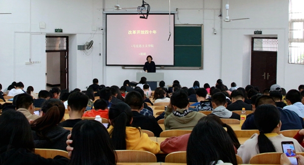在7100教室开展“改革开放四十周年”形势政策讲座,本次讲座由胡娟老师主讲。