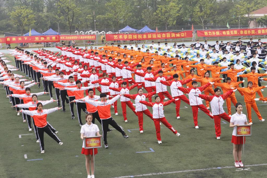 方队身着印着中国字样的红色外套,高举院旗,高呼口号,怀着坚定的信念,迈着整齐的步伐,昂首走进会场,为大会献上了精彩纷呈的团体表演。比赛开始前,全校团体操成员共同演绎广播操,av解说