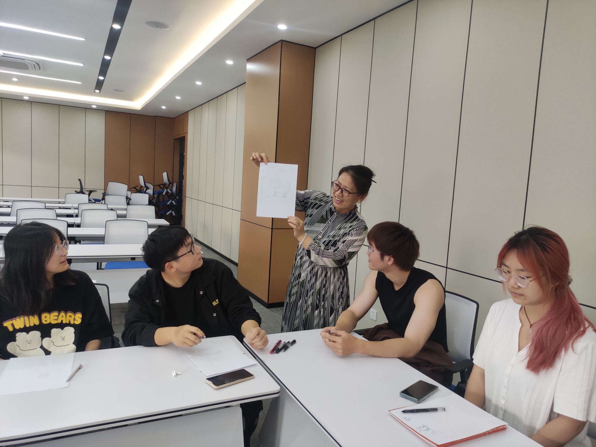 活动破冰后,陈老师引导同学们画出自画像:最符合自己目前状态的动物。狮子、熊猫、狼、兔子......一个个生动形象的动物跃然纸上,每个人画的都各不相同。组内分享环节同学们分别从父母、祖父辈、孩子三个角度去描述所画的动物:有人说了父母的希冀,有人说了爷爷奶奶的宠爱,也有人说了孩子的认可,大家互相信任、彼此坦诚,真诚的沟通拉近了心灵的距离,也加深了同学们对自己的认知。最后,陈老师让大家写下两句话,一句送给自己,一句送给组员,并在组内互相分享,传递祝福。心理团辅活动在温暖的氛围中走到了尾声,同学们纷纷表示此次活动非常有趣,让他们更加深入地了解和认识了自己,受益良多。