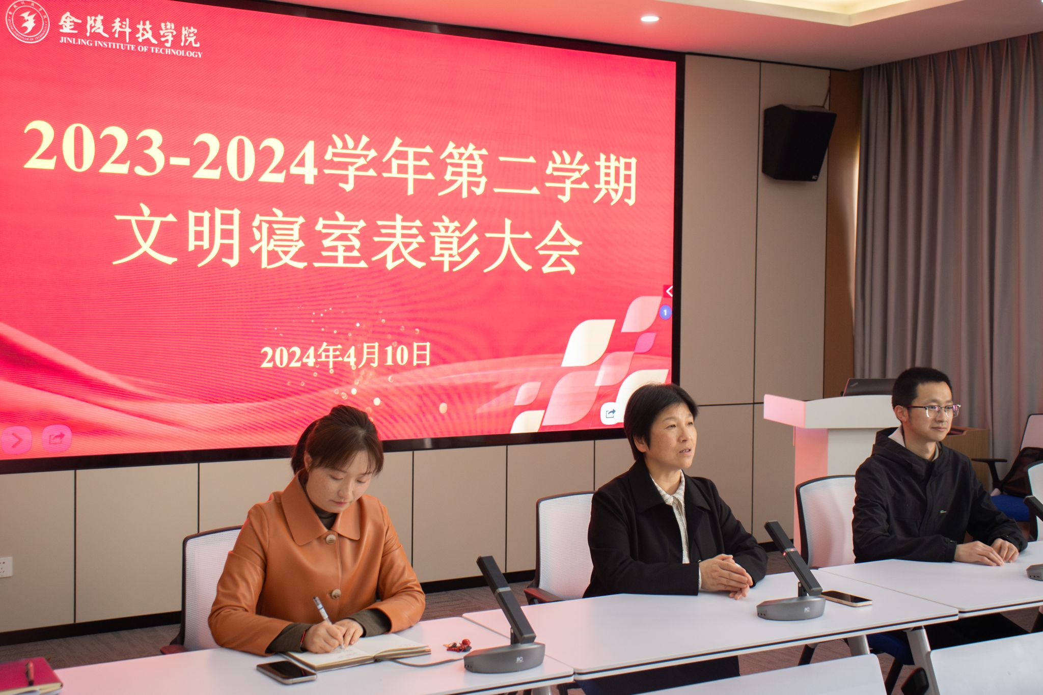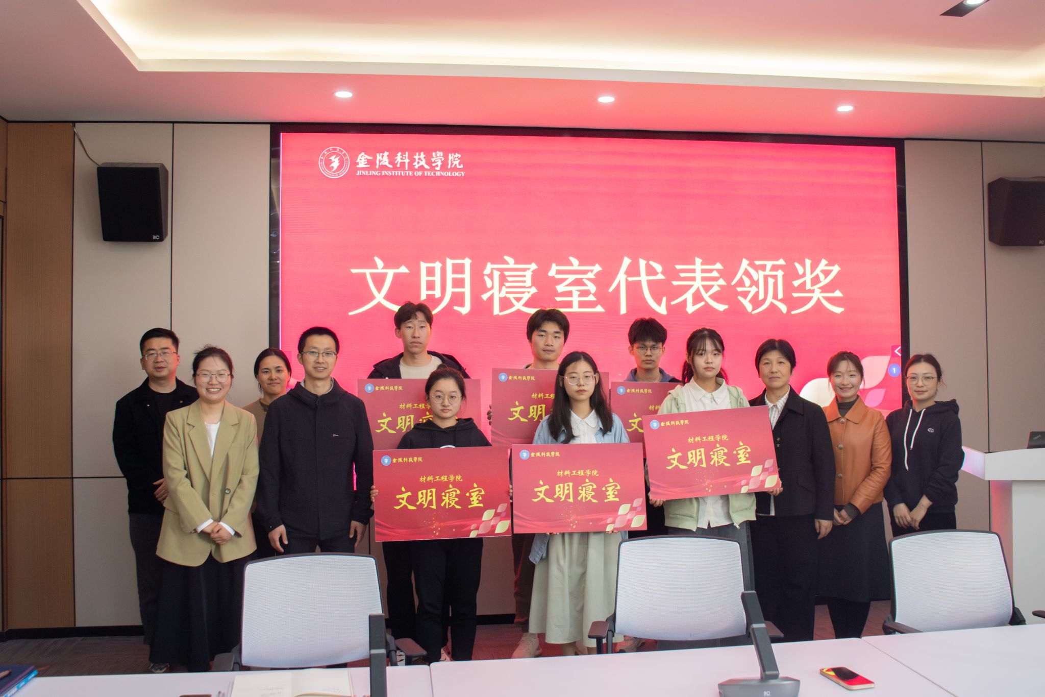 在知行楼A506举行了2023-2024学年第二学期文明寝室表彰大会,院党委书记陈健、党委副书记韩铖、全体辅导员、获奖宿舍代表出席了本次表彰大会。