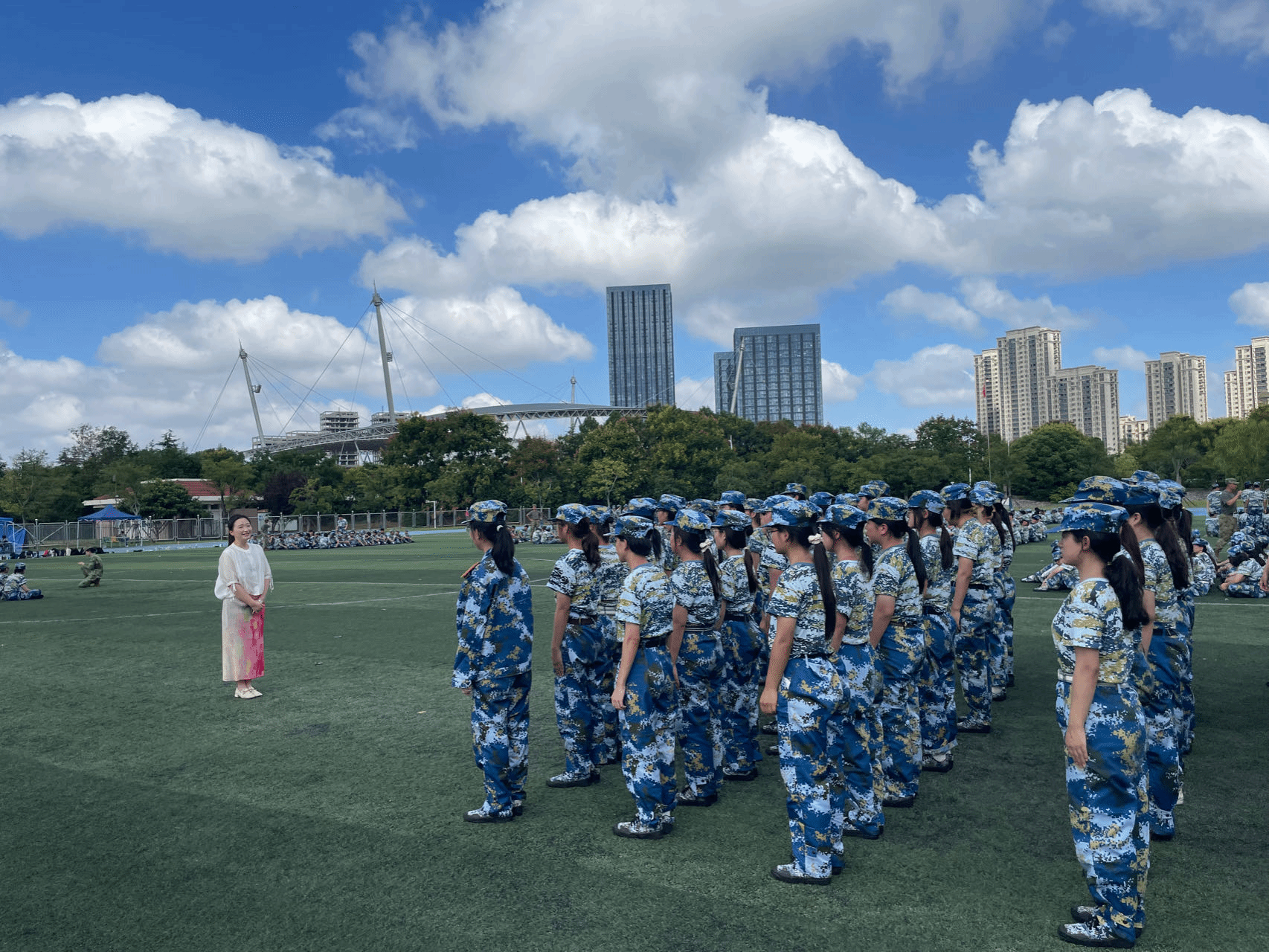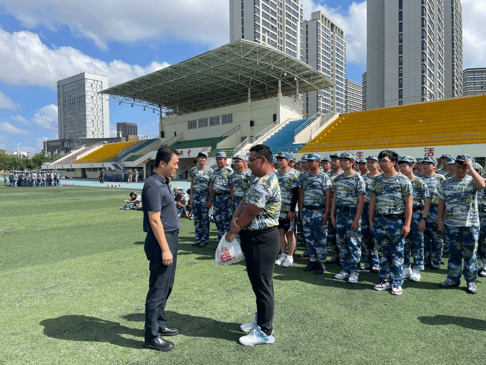 军训场上,同学们身着统一的迷彩服,队列整齐,精神饱满。尽管天气炎热,但大家依然保持着高昂的斗志和坚定的信念,开展各项技能的训练,充分展现了材料学子的坚韧与毅力。院领导首先与承训教官进行深入交流,详细了解同学们的训练情况,对他们的辛苦付出表示感谢。随后鼓励同学们要珍惜军训这段宝贵时光,不仅要锻炼体魄、磨砺意志,更要学会团结协作、勇于担当,希望大家超越自我、坚持到底,将军训中锻炼出的坚强品格和优良作风带到今后的学习生活中。