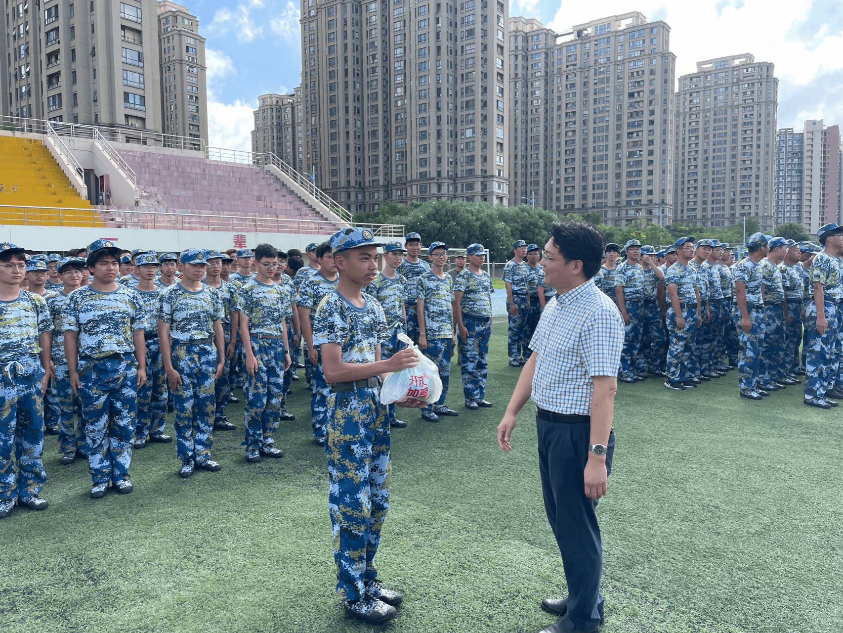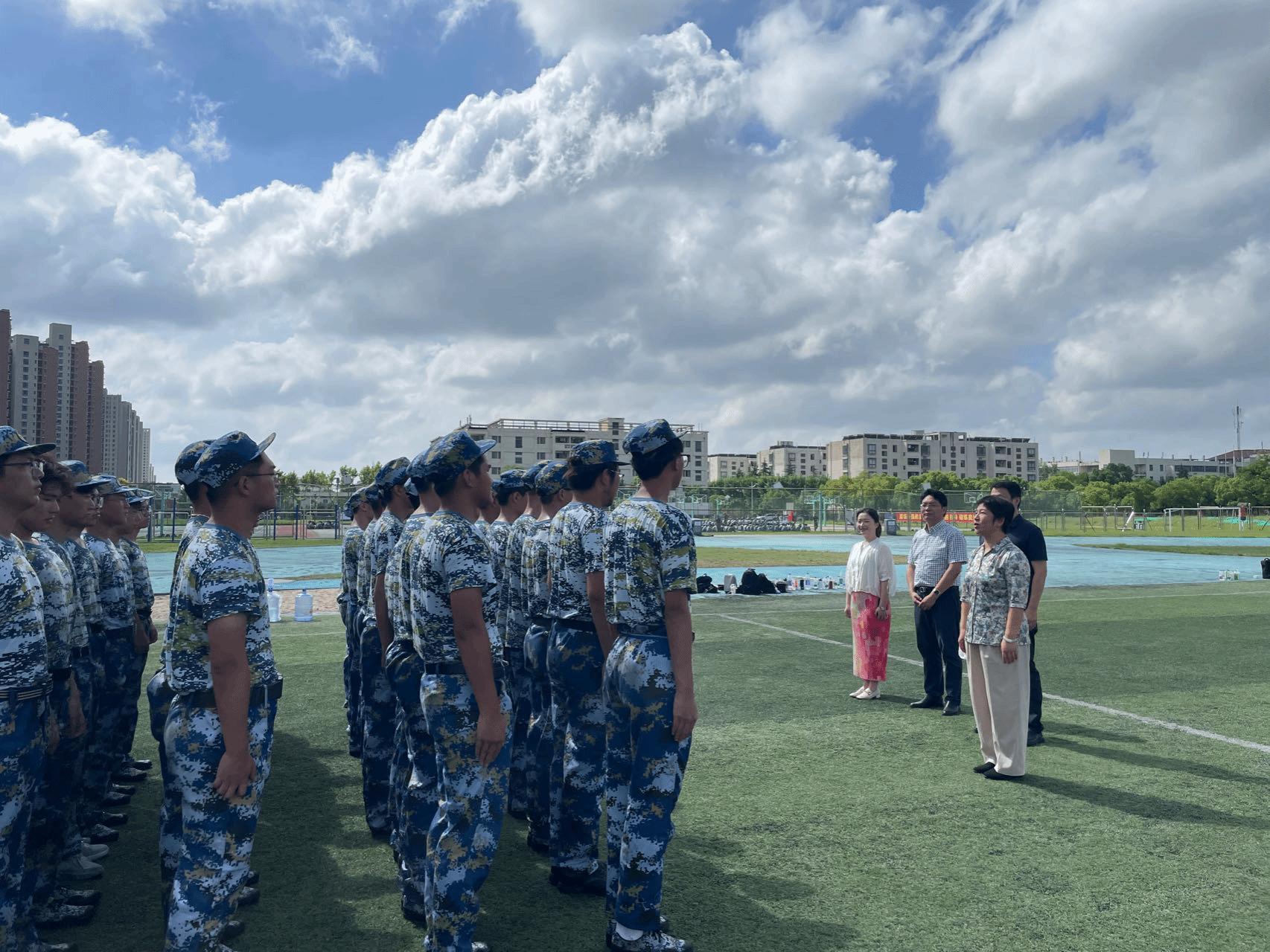 党委书记陈健、院长叶原丰、党委副书记韩铖、副院长管航敏一行深入新生军训现场开展慰问活动,新生辅导员邵云龙陪同慰问。