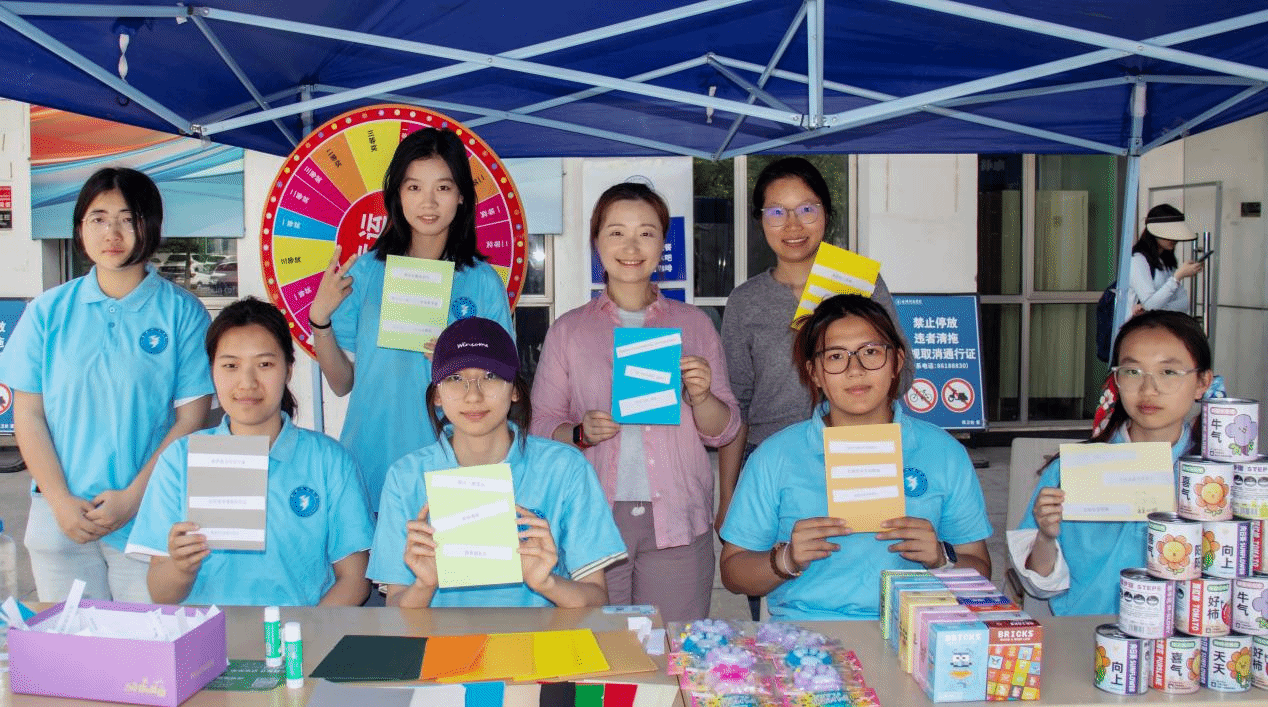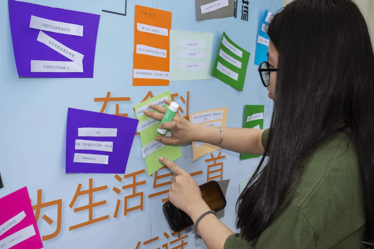 承办。活动现场,薄荷绿、樱花粉、暖橘色等十余种色调的卡纸整齐陈列,参与者从“诗库”中挑选三行契合心境的句子,拼贴成一首三行诗,并粘贴于主题展板上,于文字重组中感受温暖的心灵力量。完成创作的同学还可参与幸运转盘抽奖,指尖一转,用才华赢取捏捏乐、掌上盆栽、积木等小礼品。展板前人头攒动,同学们或驻足挑选诗句、或专注拼贴创作,转盘抽奖区欢呼声此起彼伏,现场气氛轻松活跃,青春气息洋溢在整个活动现场。