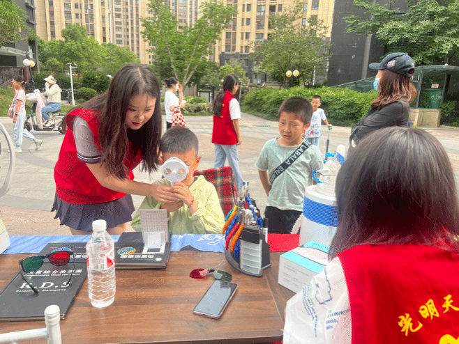 宜欣视觉健康大学生创业团队携手“光明天使”社团前往玉树路社区龙庭水岸小区开展“童趣端午,爱眼护眼”志愿服务活动,玉树路社区团总支书记万瑀、av解说