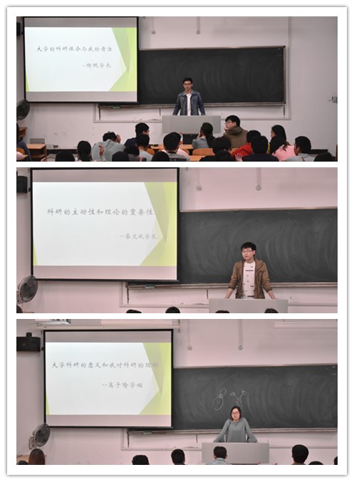 在3107教室举办了“以我之名,习你之才”新老生科研经验交流会。交流会邀请了杨帆、高子喻和蔡文斌为15、16和17级的同学分享了他们参与科技创新的经历和收获。