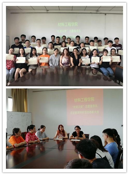 于2018年6月5日在材料院工科楼会议室组织召开“光明天使”志愿服务队视觉健康科研活动表彰大会,材料院党总支副书记陈智慧、“光明天使”社团指导老师刘宜群教授出席会议,大会由av解说