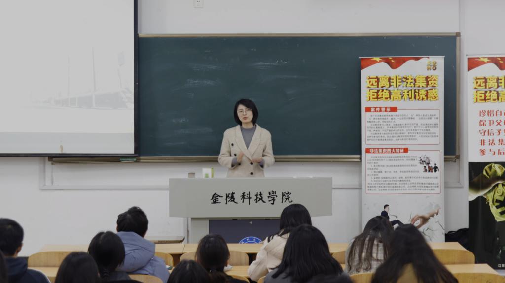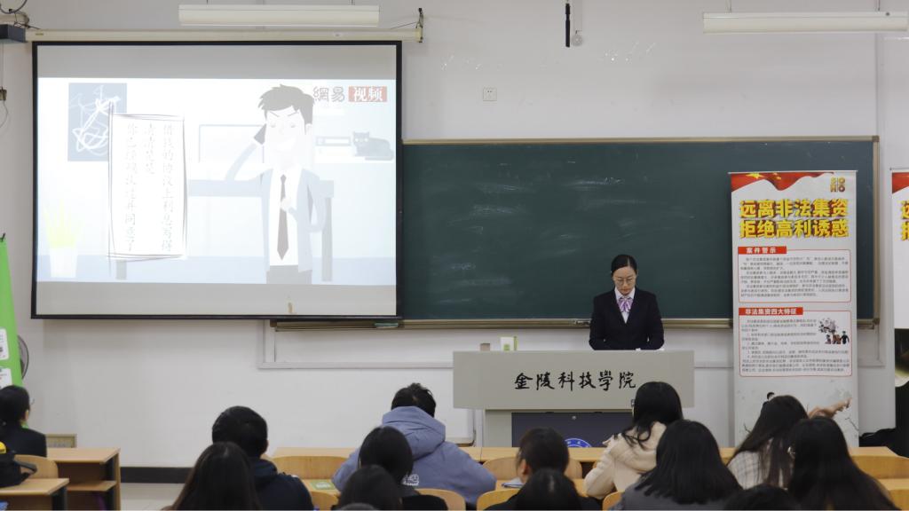 紫金农商银行夏婧就“远离非法集资,拒绝高利诱惑”主题发表讲话。通过列举了众多深陷校园贷骗局的受害人实例,夏婧从专业金融知识角度解释了什么是校园贷,指出校园贷的底层逻辑,拆穿校园贷就是披着金融外衣的骗局陷阱。主讲人告诫同学一定要认清其中的“贷”价,坚决拒绝“校园贷”,并提出以下几点防范建议:1、正规的大学生贷款只有生源地信用助学贷款和校园地国家助学贷款这两种,其他的贷款渠道都是有安全隐患的。2、树立正确的消费观,合理安排自己的消费,攀比心理、拜金主义均不可有。3、如不慎落入校园贷圈套,应立即向老师、家长寻求帮助,避免弥足深陷,酿成不可挽救的悲剧。