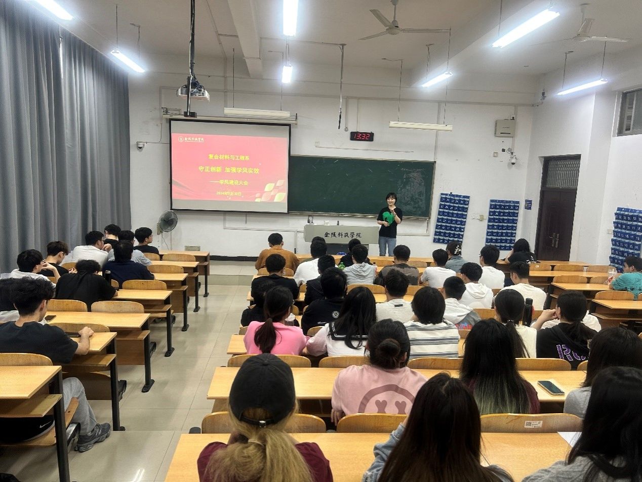 为深入贯彻落实教育部关于加强和改进大学生思想政治教育的指导意见,全面提升学生的综合素质和创新能力,复合材料与工程系于2024年5月30日在教室举行了以“守正创新,加强学风实效”为主题的学风建设大会。