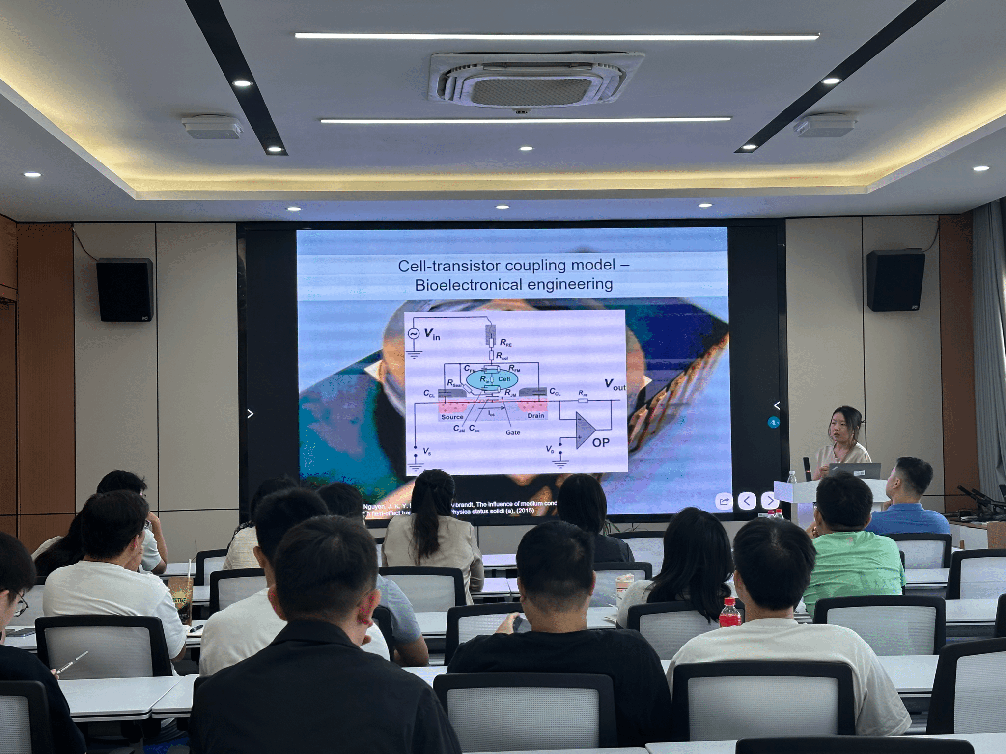 老师就微纳器件的材料与尺寸要求、是否能做到对单个细胞做到一一对应的记录等问题进行了科研交流。报告现场师生互动交流反响热烈,掌声不断。
