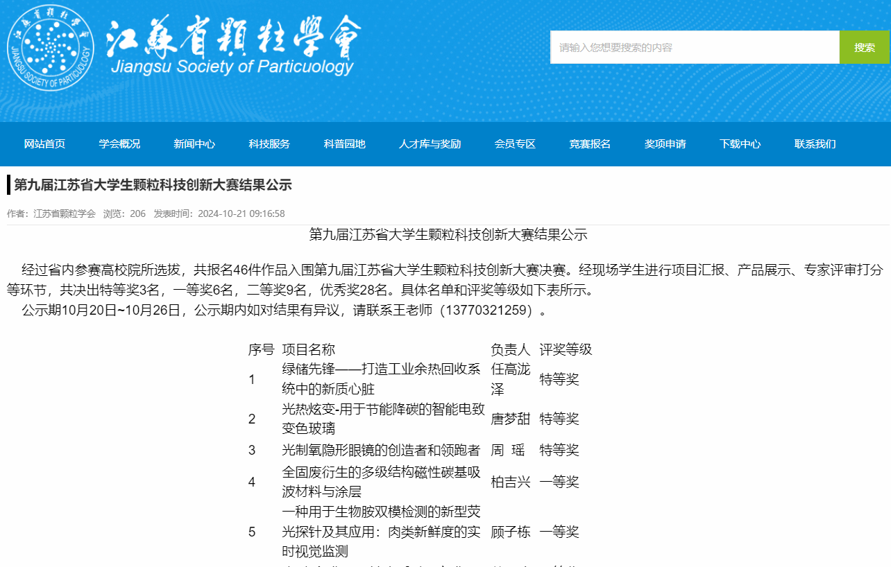近日,第九届江苏省大学生颗粒科技创新大赛成功举行。本次大赛由江苏省颗粒学会联合江苏省环境科学学会、江苏省化学化工学会等主办,江苏城乡建设职业学院承办,共吸引了全省多所学校约500余人参赛,46件作品入围决赛。经学生现场项目汇报、产品展示、专家打分等环节,共决出特等奖3名、一等奖6名、二等奖9名、优秀奖28名。