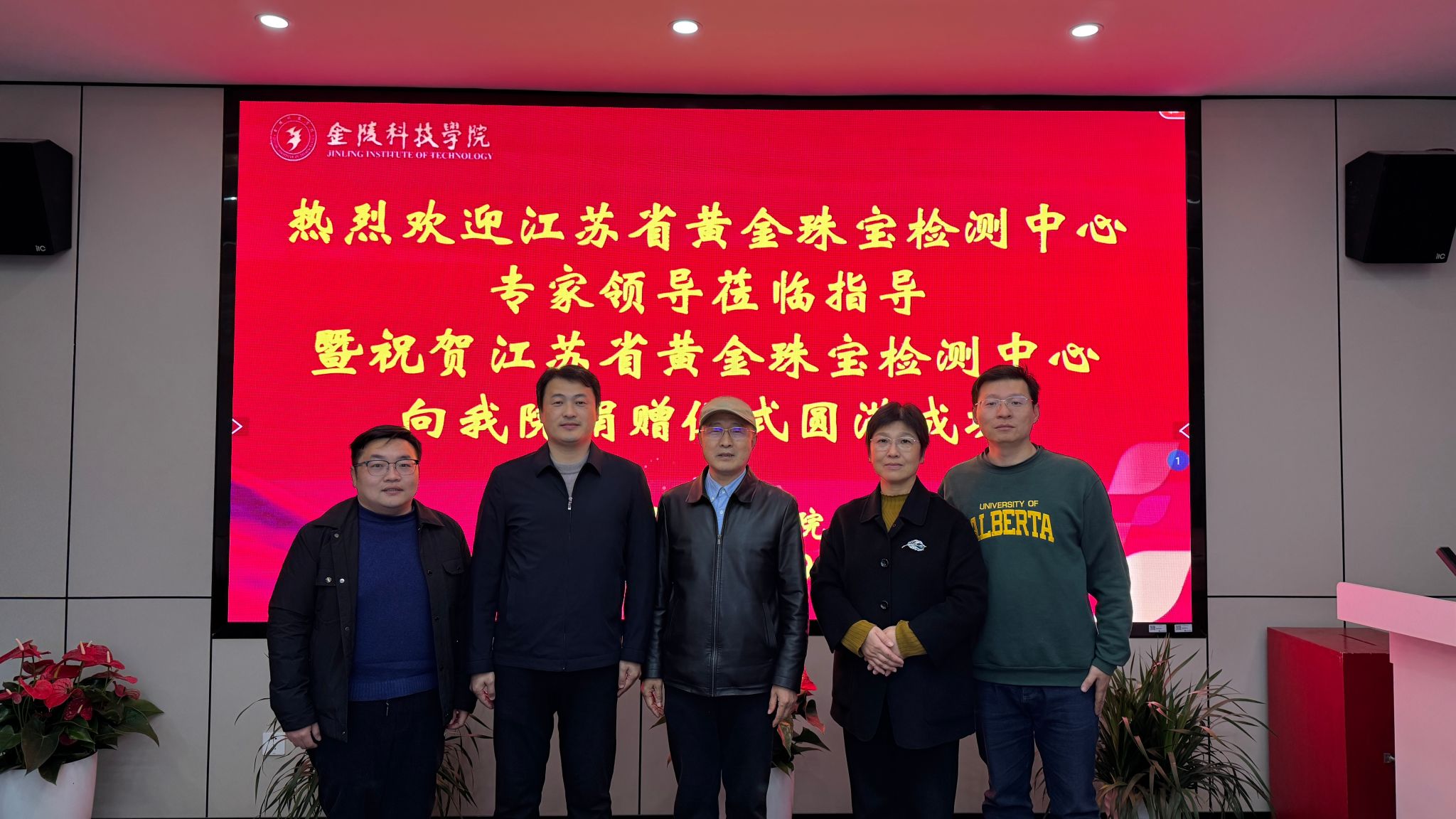 院长叶原丰教授和党委书记陈健代表学院向江苏省黄金珠宝检测中心有限公司董事长朱德茂研究员颁发捐赠证书。江苏省黄金珠宝检测中心有限公司的陈照敏,珠宝系系主任蔡逸涛博士及相关教师也参加了此次仪式。