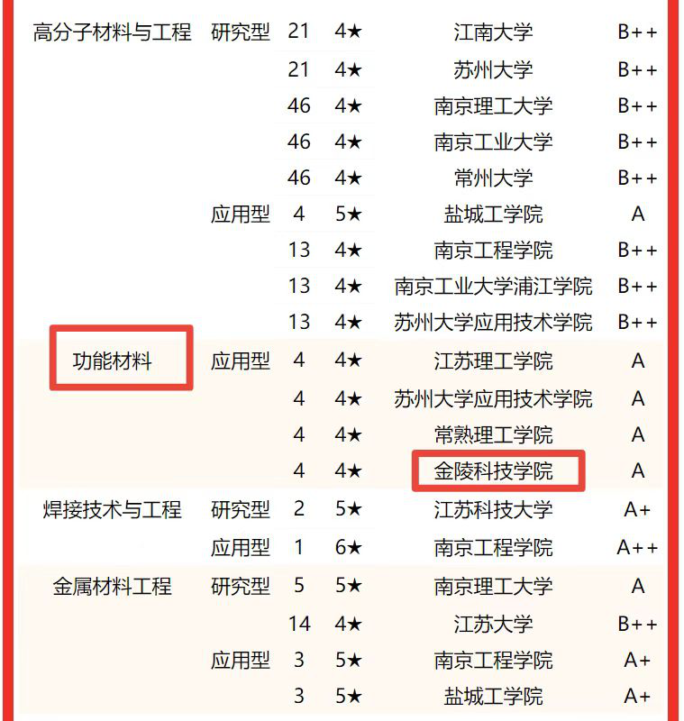 复合材料与工程专业于2011年面向全国招收公办全日制本科生;经过十年的建设,于2021年获批江苏省一流本科专业建设点;2022年校友会江苏省大学一流专业排名中,排名五星级(5★)、A++专业,在应用型专业类别中全国排名第一。